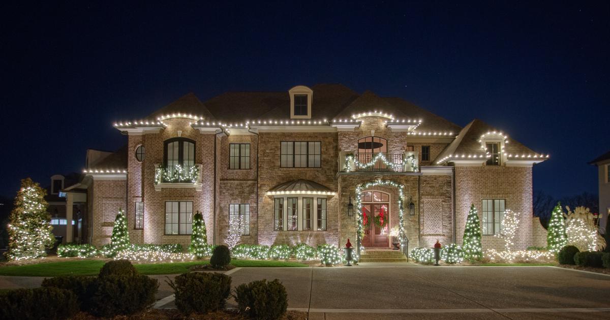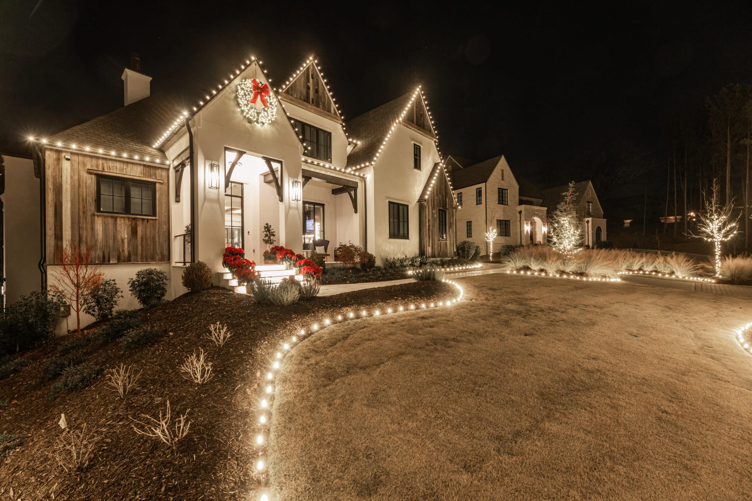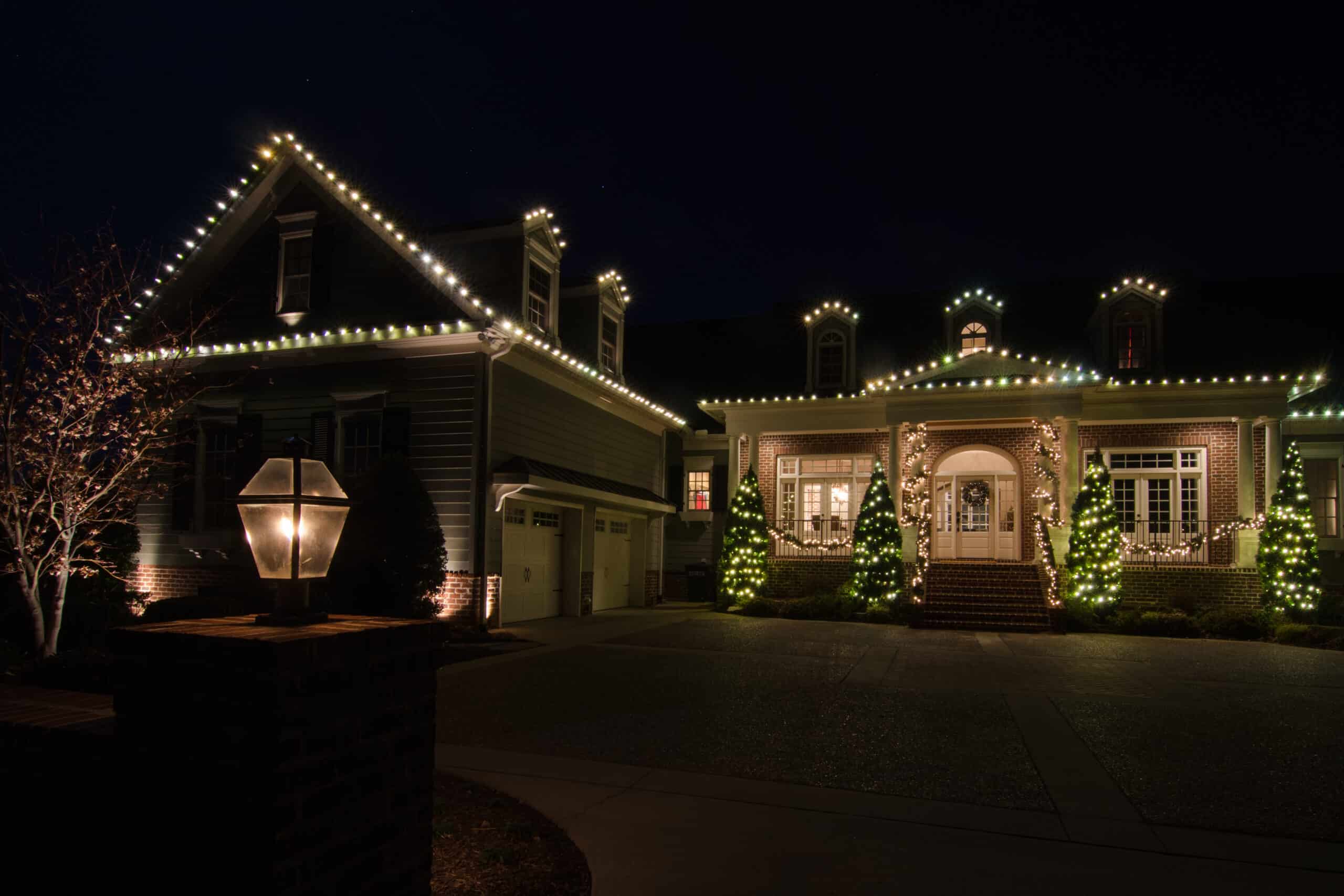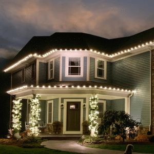 A professional holiday lighting design tailored to your property, utilizing C9 Warm White premium LED bulbs to create a sophisticated, architectural, and classic glow.